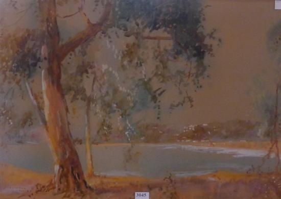 PRO HART, FIGURE BY THE LAKE, OIL ON PAPER, 19.5 X 49CM