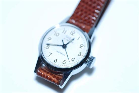 A LADIES VALGINE MANUAL WIND WRISTWATCH, TO A GOLD PLATED CASE AND BROWN LIZARD LEATHER BANDS