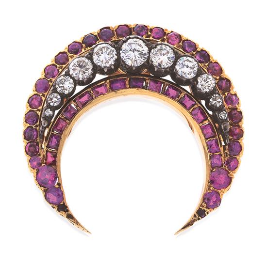 AN ANTIQUE STYLE DIAMOND AND RUBY CRESCENT BROOCH