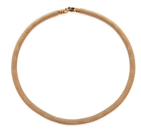 The tubular mesh collar with a fine cabochon cut sapphire set to the clasp, in 18ct gold, total weight 36.3gms, total length 415mm.