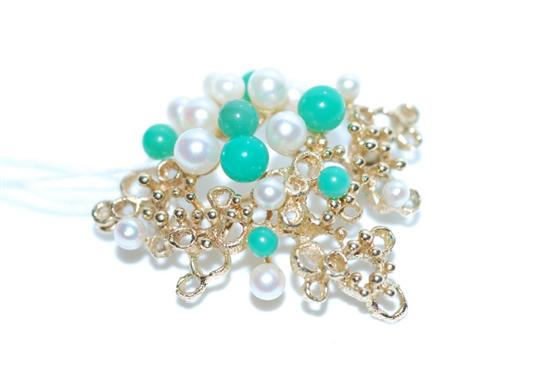 A JADE AND CULTURED PEARL SET ABSTRACT DESIGN BROOCH IN 14CT GOLD
