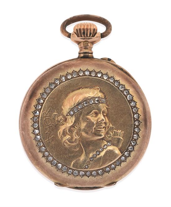 The full hunter pocket watch with applied bust of cupid decorated with rose cut diamonds, signed Vernon, the case hallmarked 14ct gold and signed F & H.