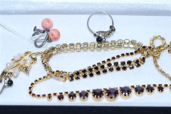 A COLLECTION OF COSTUME JEWELLERY INCLUDING CORAL EARRINGS, RHINESTONE NECKLACE ETC