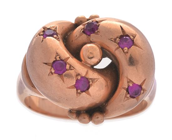 Of knot design, set with six synthetic rubies in 18ct gold, ring size M-N.
