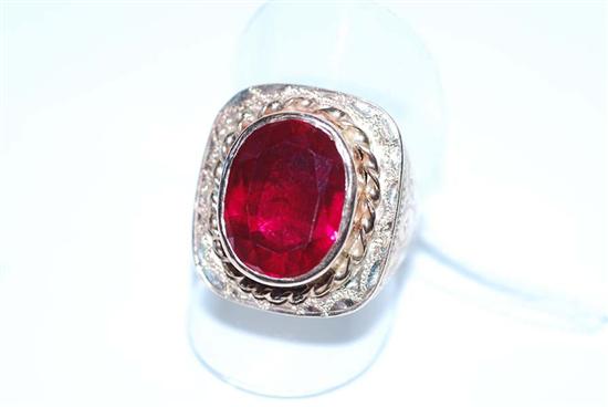 A SYNTHETIC RUBY SIGNET RING IN 9CT GOLD