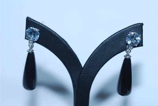 A PAIR OF ONYX AND AQUAMARINE DROP EARRINGS IN 18CT WHITE GOLD