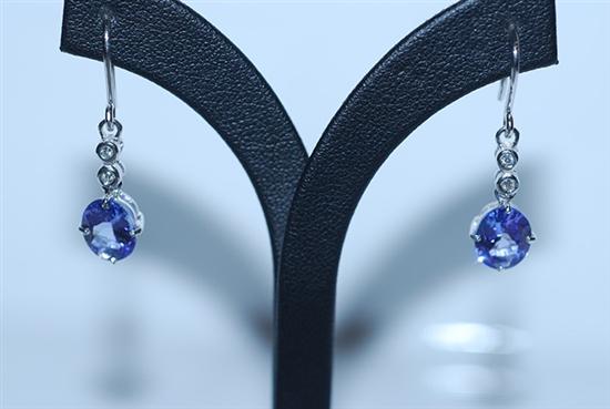 A PAIR OF TANZANITE AND DIAMOND DROP EARRINGS TO HOOK FITTINGS IN 18CT WHITE GOLD