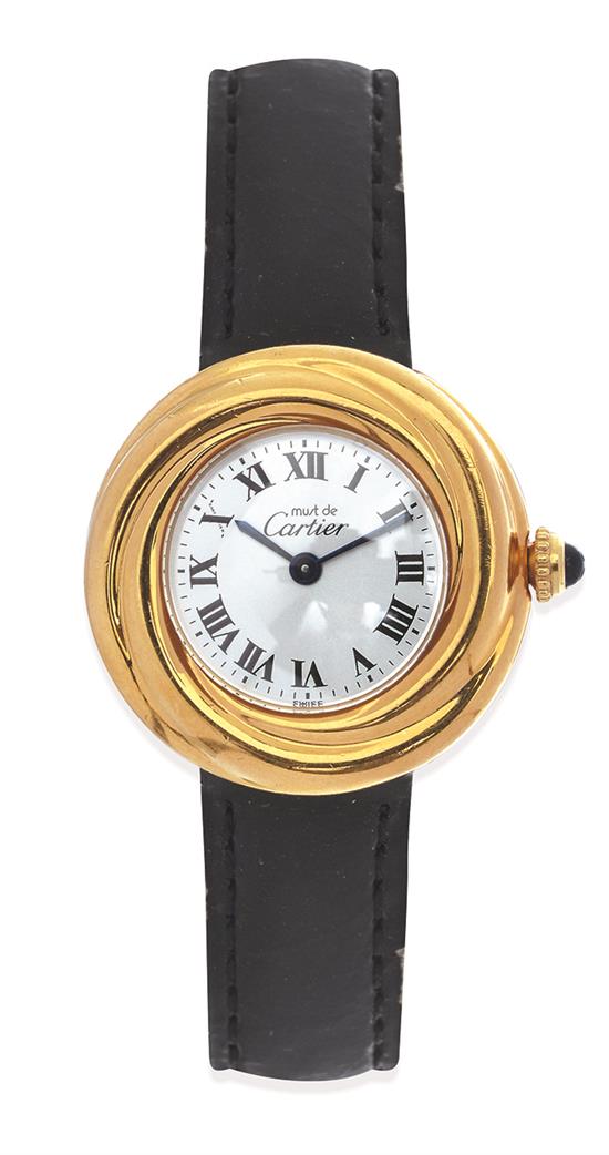 Quartz movement, circular silvered dial with Roman numerals, signed case, dial and movement, gold plated silver trinity style case with black leather bands, 25mm diameter.