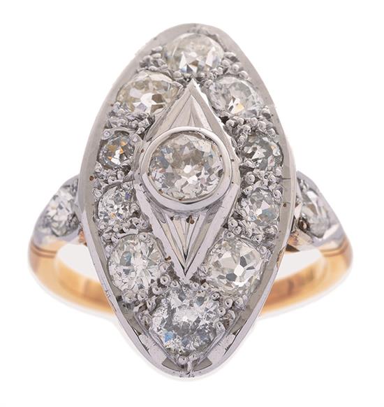 The marquise shaped plaque set with old European cut diamonds totalling 3.6cts, in 18ct two tone gold, independent valuation available, ring size R-S.