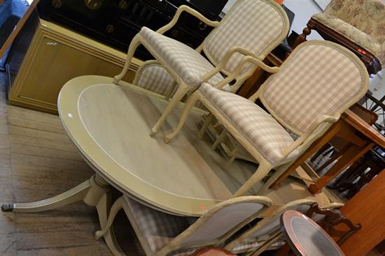 A LARGE LIME WASHED REGENCY STYLE EXTENDING TABLE WITH THREE SPARE LEAVES INCLUDING EIGHT CHAIRS AND TWO CARVERS