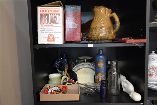 TWO SHELVES INCL. SPECKLED SUNSHINE KETTLE, VINTAGE TOASTER, SNUFFLEUPAGUS, MONKEY, MATCHBOX CARS ETC
