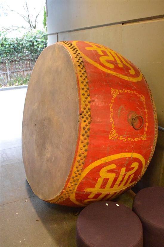 A LARGE RUSTIC PAINTED ORIENTAL SIDE BOARD WITH SIX DOORS AND SEVEN DRAWERS