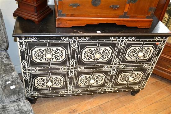 A MORROCAN BLACK AND WHITE BONE INLAID CHEST OF DRAWERS