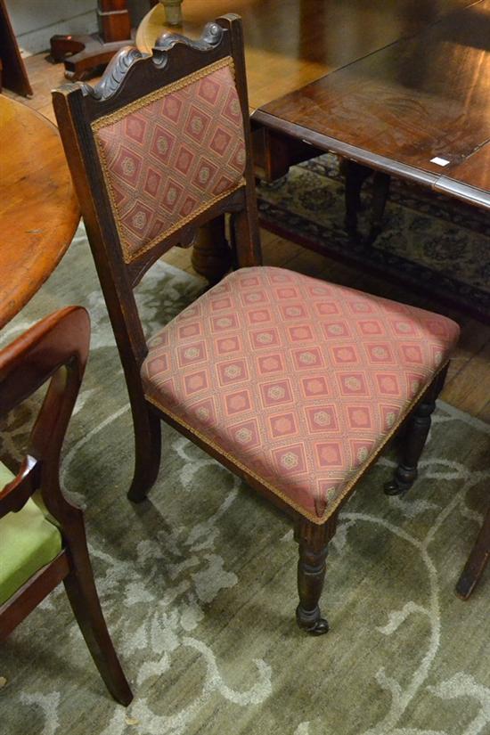 A SET OF six EDWARDIAN DINING CHAIRS ON CASTORS (ONE CHAIR AF)