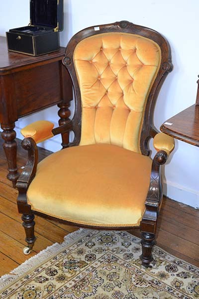 A LATE VICTORIAN WALNUT GENTLEMANS CHAIR IN YELLOW AND VELVET UPHOLSTERY