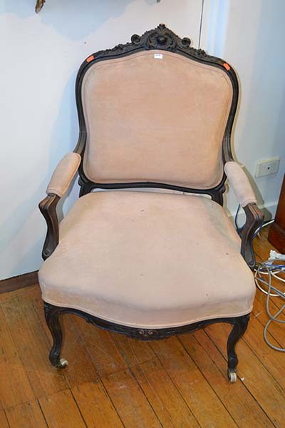A LOUIS XVI ARM CHAIR IN DUSTY PINK UPHOLSTERY