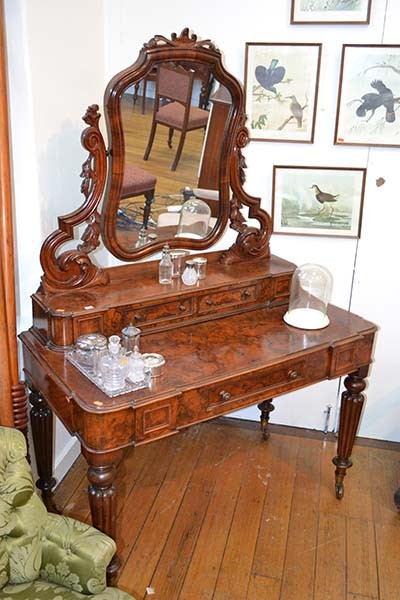 A VICTORIAN BURR WALNUT MIRROR BACKED DRESSING TABLE