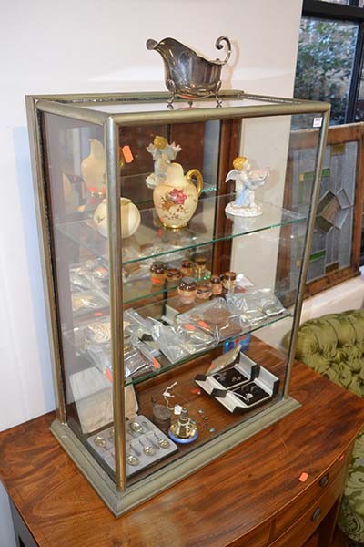 AN ANTIQUE GLAZED NICKEL BOUND DISPLAY CABINET, 56.5CM WIDE X 76CM HIGH X 31CM DEPTH