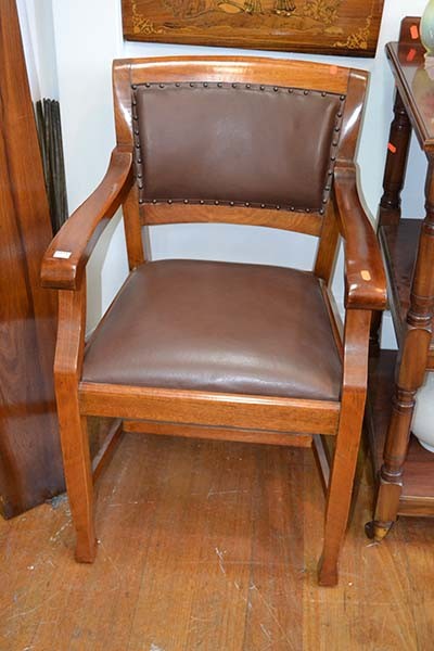 AN EARLY 20th C. OAK AND LEATHER BOUND ARM CHAIR
