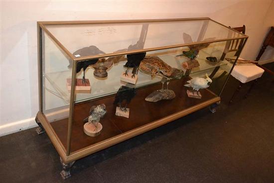 AN ANTIQUE NICKEL BOUND GLAZED DISPLAY CABINET ON CAST IRON FEET, 182CM WIDE X 92CM HIGH X 53CM DEPTH