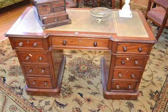 A VICTORIAN MAHOGANY KNEE HOLE DESK WITH LEATHER INSET TOP