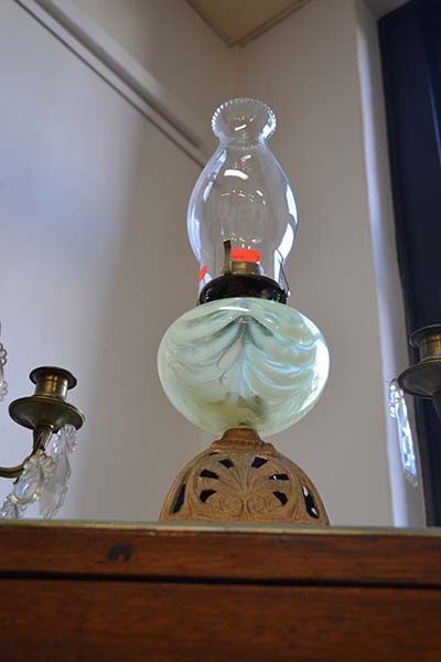 VICTORIAN SWIRLED VASELINE GLASS AND BRASS KEROSENE LAMP