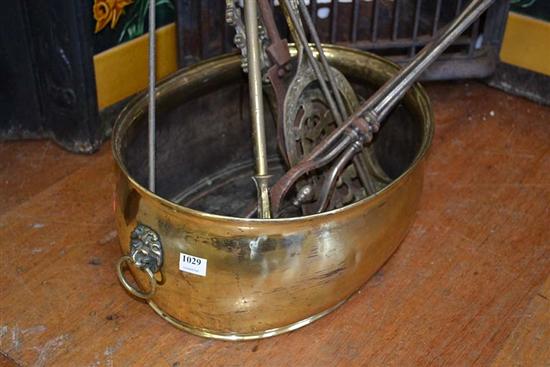 AN ANTIQUE BRASS JARDINIER WITH LION HANDLES