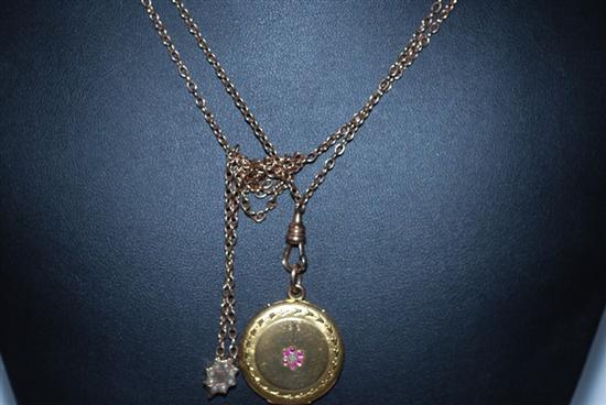 A GOLD LINED STONE SET LOCKET TO A FINE TRACE CHAIN AND SLIDE