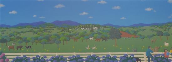 JOANNE NETTING, THE ROCKMAN FARM 2000, ACRYLIC ON CANVAS, 50 X 121CM