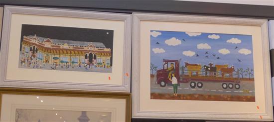 PAIR OF WORKS BY FRANE LESSACK 1)CATTLE TRUCK AND TWO FIGURES, OIL ON CANVAS ON BOARD, 59.5 X 89.5CM 2)FREEMANTLE MARKETS, OIL ON CANVAS ON BOARD, 37.5 X 75.5CM