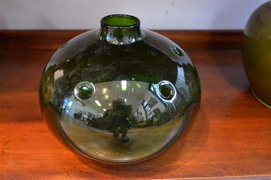 HOLMEGAARD GREEN GLASS BULBOUS BOTTLE VASE WITH FIVE CIRCULAR OPENINGS