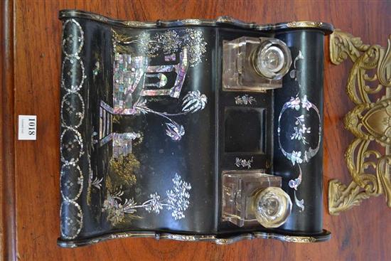 VICTORIAN JENNENS & BETTRIDGE MOTHER OF PEARL INLAID PAPIER MACHE DOUBLE INKWELL STAND WITH ARCHITECURAL SCENE