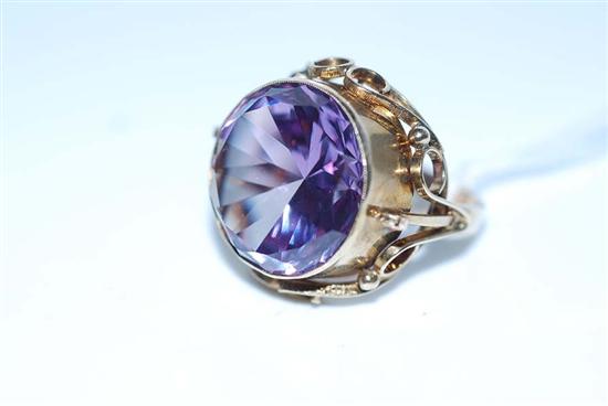 AN ANTIQUE 9CT GOLD SYNTHETIC CORUNDUM (ALEXANDRITE TYPE) SET RING