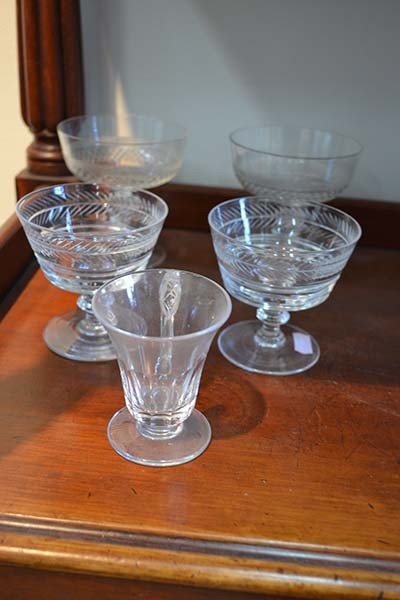 TWO PAIRS OF CUT CRYSTAL DESSERT COMPORTS AND A 19TH CENTURY GLASS HANDLED LIQUEUR