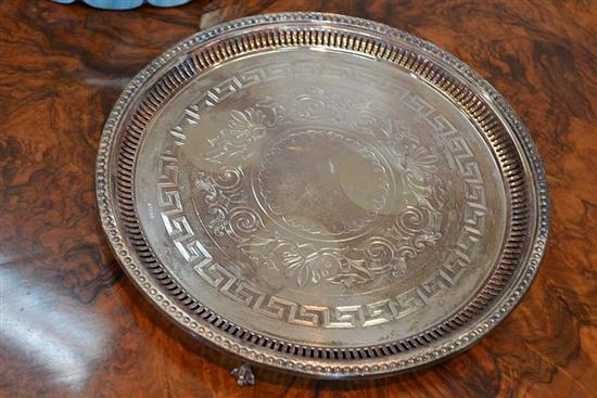 SILVER PLATE GALLERY EDGED CIRCULAR TRAY ON THREE BALL AND CLAW FEET