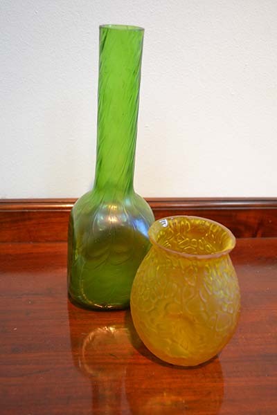 TWO LOETZ STYLE ART GLASS VASES (CHIPS)