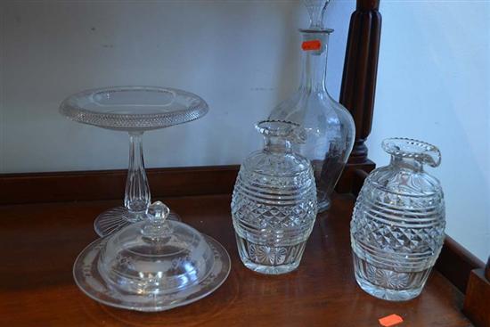 A PAIR OF CUT CRYSTAL DECANTERS, LIDDED BOWL, ETCHED GLASS DECANTER AND ETCHED GLASS COMPORT