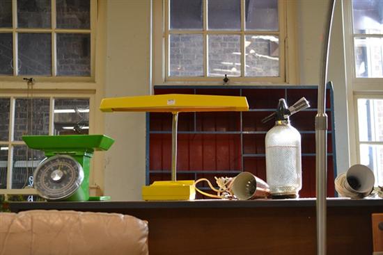 A GROUP LOT OF ANODIZED LAMPS, A SCALE, SODA STREAM AND YELLOW DESK LAMP