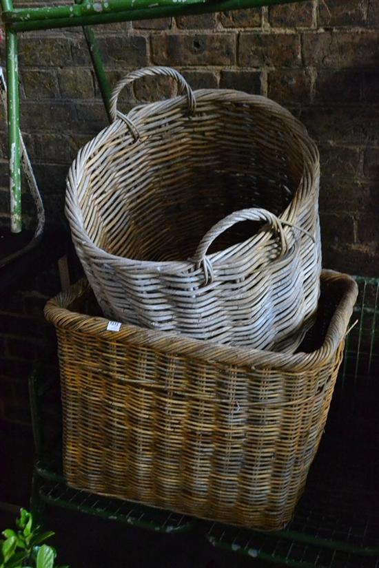 TWO CANE BASKETS AND ONE DECORATIVE MAGAZINE HOLDER