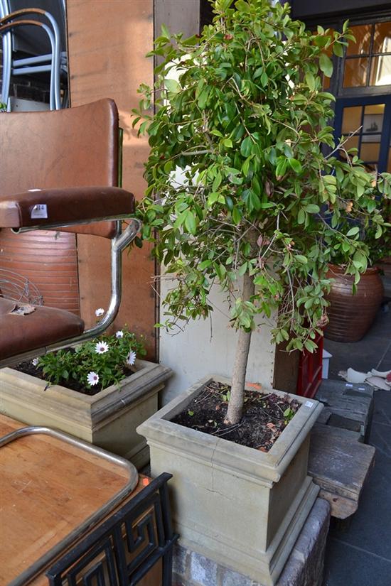 THREE ASSORTED PLANTS IN MATCHING CONCRETE POTS