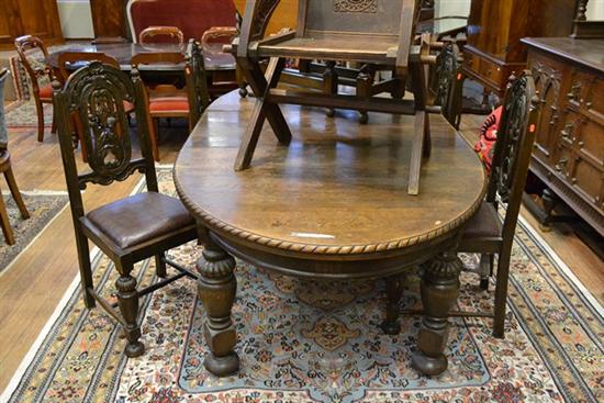 A JACOBEAN STYLE EXTENDING OAK DINING TABLE WITH SIX MATCHING CHAIRS AND TWO SPARE LEAVES (CHAIRS A/F)