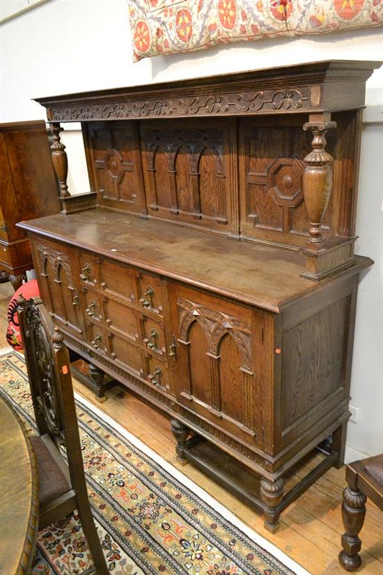 A JACOBEAN STYLE OAK SIDE BOARD (PARTS AND KEY IN OFFICE)