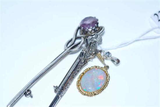 A COLLECTION OF JEWELLERY INCLUDING TWO SILVER BROOCHES AND AN OPAL SET PENDANT ON CHAIN IN SILVER AND SILVER GILT (PARTS 14687 - 14689)