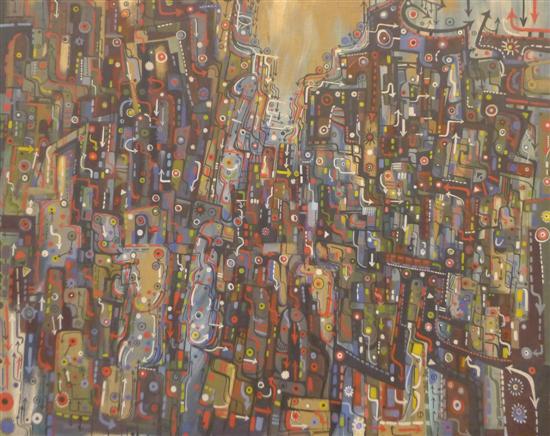 ARTIST UNKNOWN, GEOMETRIC CITY SCAPE, OIL ON CANVAS, 101 X 127CM