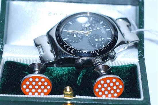 A GENTS SWATCH WATCH (NO BANDS) TOGETHER WITH A PAIR OF ENAMEL CUFFLINKS, BOXED (PARTS 10857 - 10858)