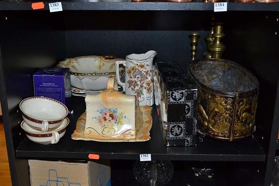 ONE SHELF OF ASSORTED ITEMS INCLUDING STRACHAN GOBLETS, ROYAL DEVON CHINA, BRASS CANDLESTICKS ETC.