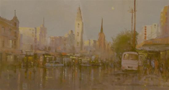 INITIALLED LOWER RIGHT, STREET SCENE, 1989, OIL ON PAPER