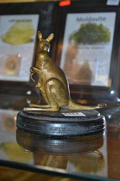 SMALL CAST BRONZE KANGAROO WITH JOEY ON WOODEN BASE