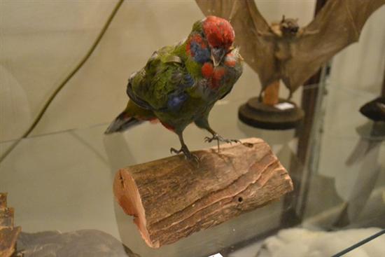 AN ANTIQUE TAXIDERMIED ROSELLA SPECIMEN MOUNTED ON LOG