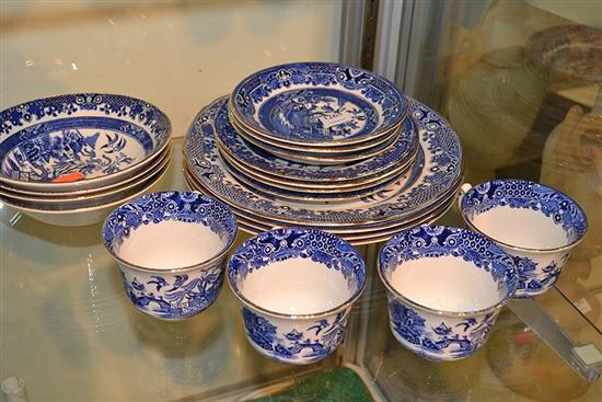 BURLEIGH WARE WILLOW PATTERN TEA SET FOR THREE PLUS EXTRAS INCLUDING SOUP BOWLS AND UNDER PLATES